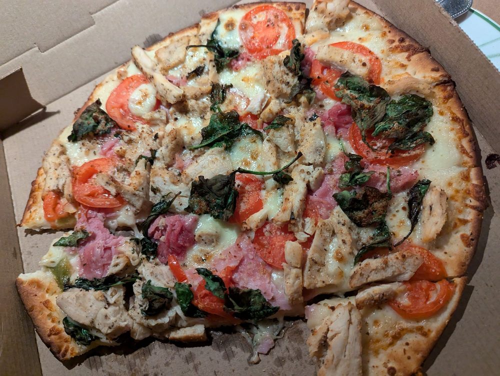 Family recipe pepperoni, shaved ham, sliced salami, freshly cut Roma tomatoes, green peppers, banana peppers, black olives, smoked Provolone, Romano. Made fresh daily.